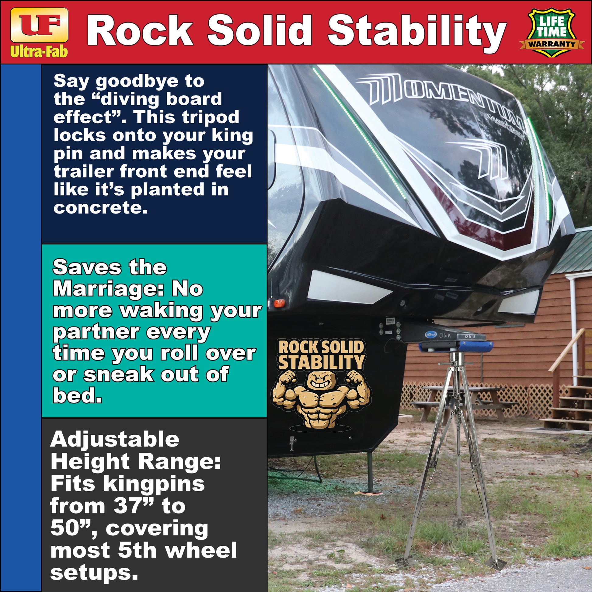 - Rock-Solid King Pin Stability – Eliminates the dreaded “diving board effect.” Locks onto your 5th wheel king pin to make the front end feel planted in concrete. Adjustable height fits kingpins from 37"–50".