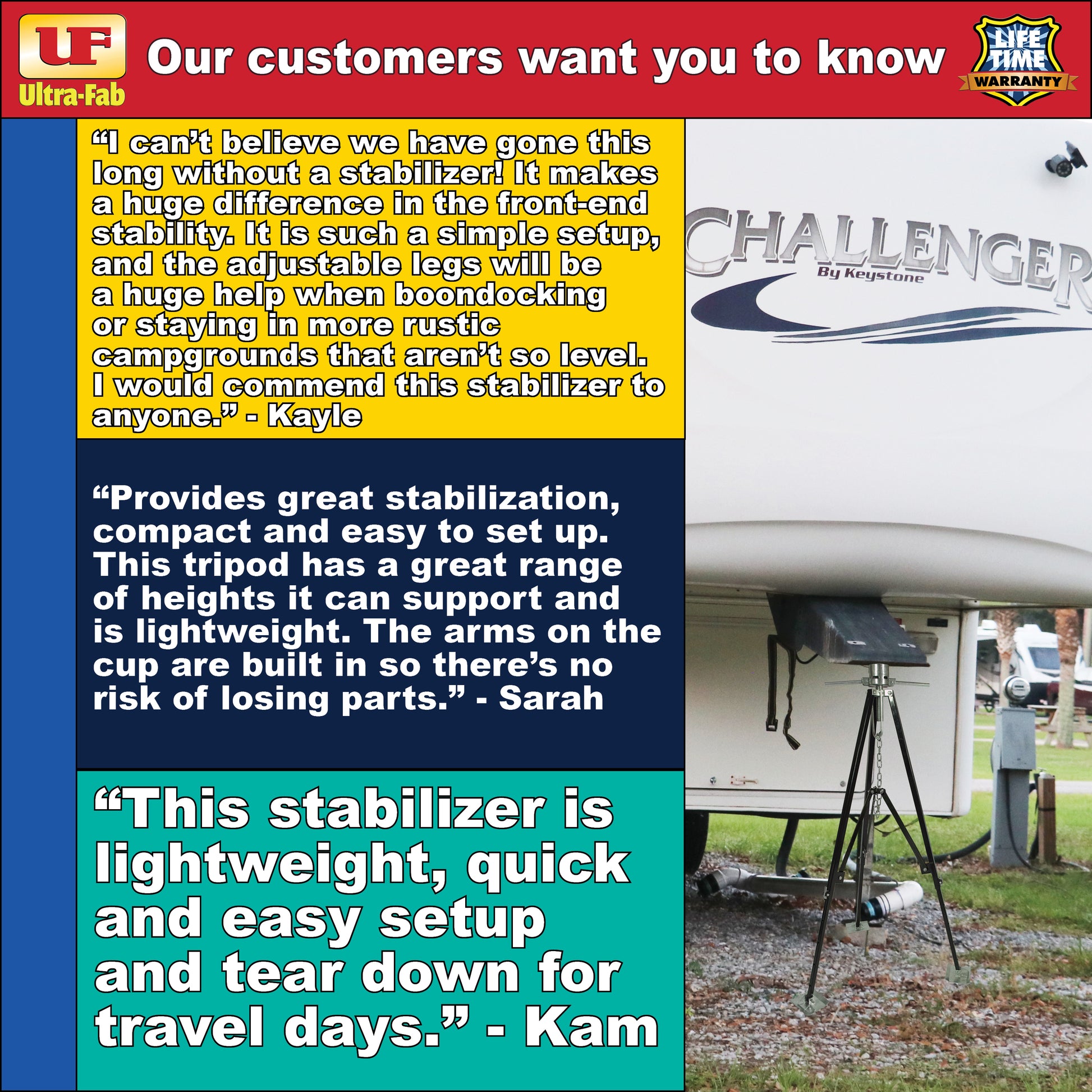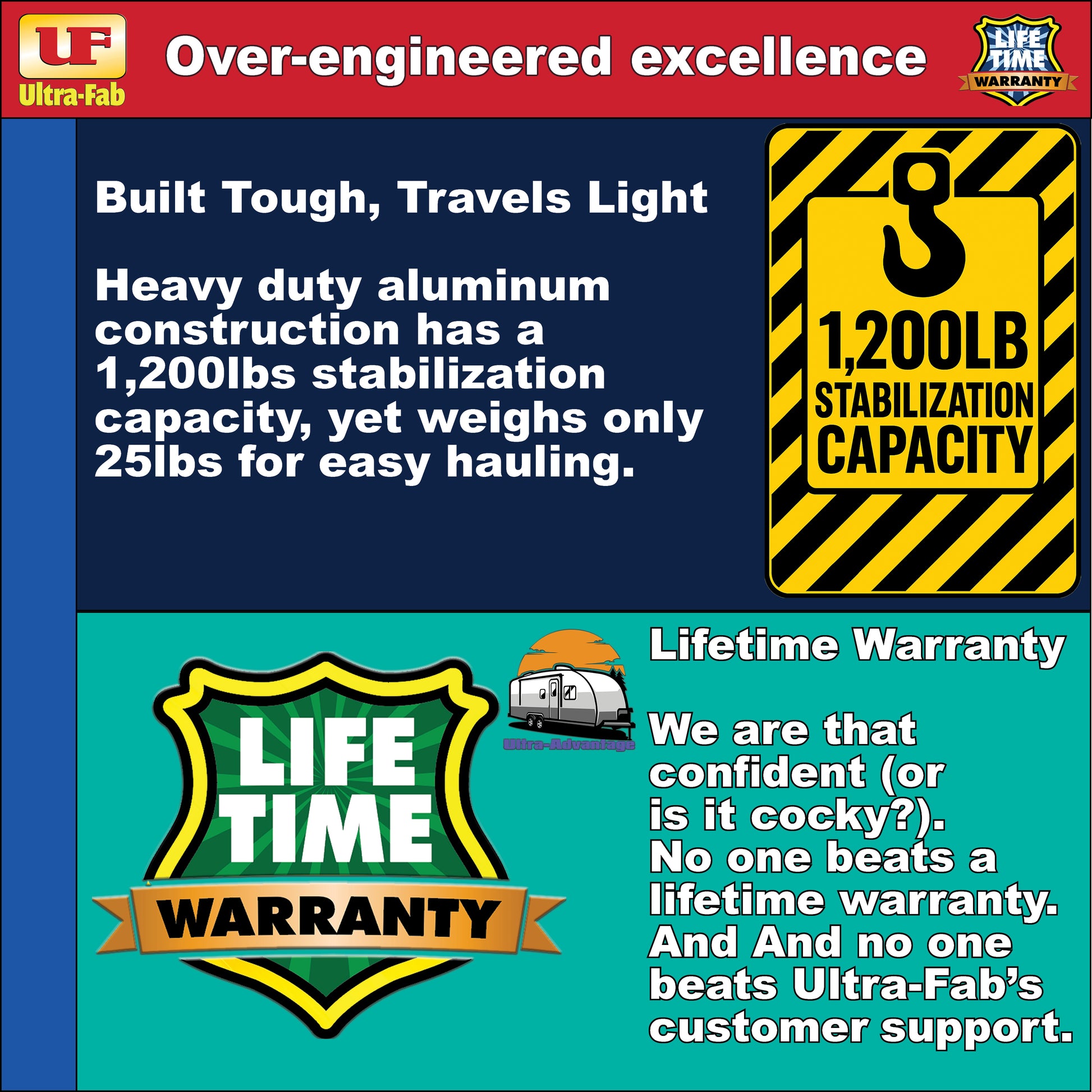 - Lockable, Fast, and Worry-Free: Built-in hitch cup with included padlock keeps your stabilizer secure. Quick-latch design means faster setup and more time to relax. Backed by Ultra-Fab quality and a lifetime warranty. And no one beats a lifetime warranty.