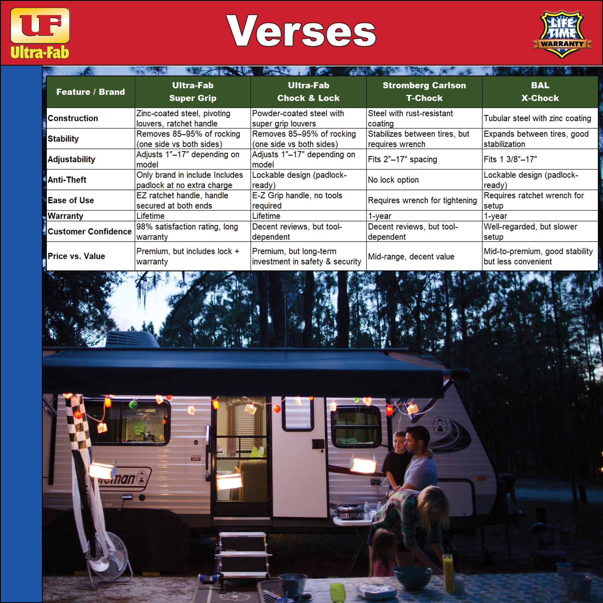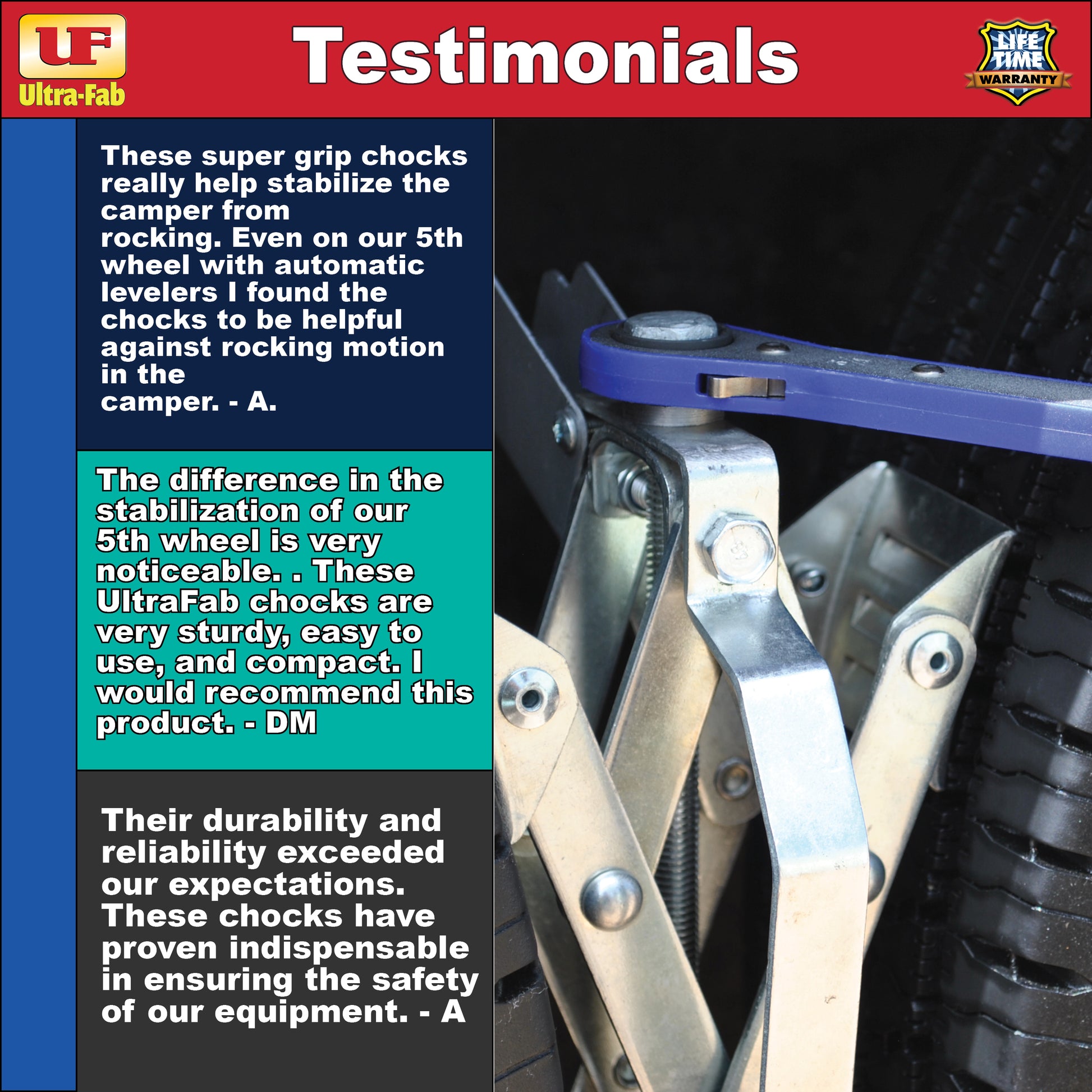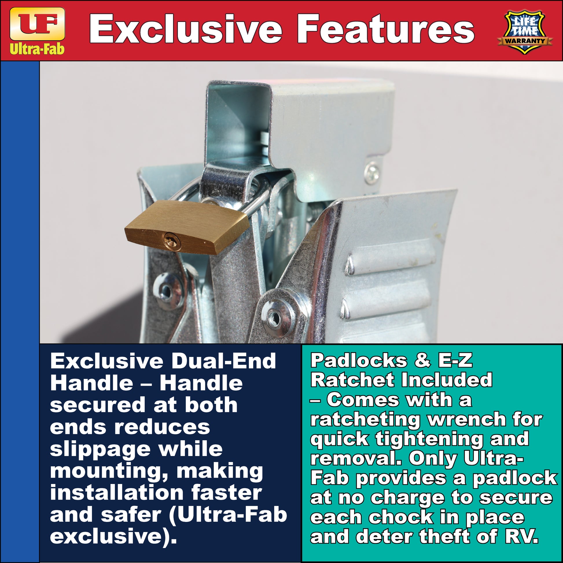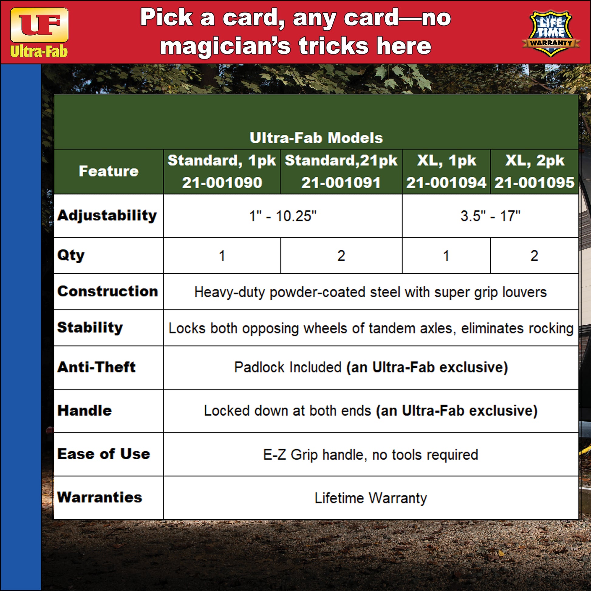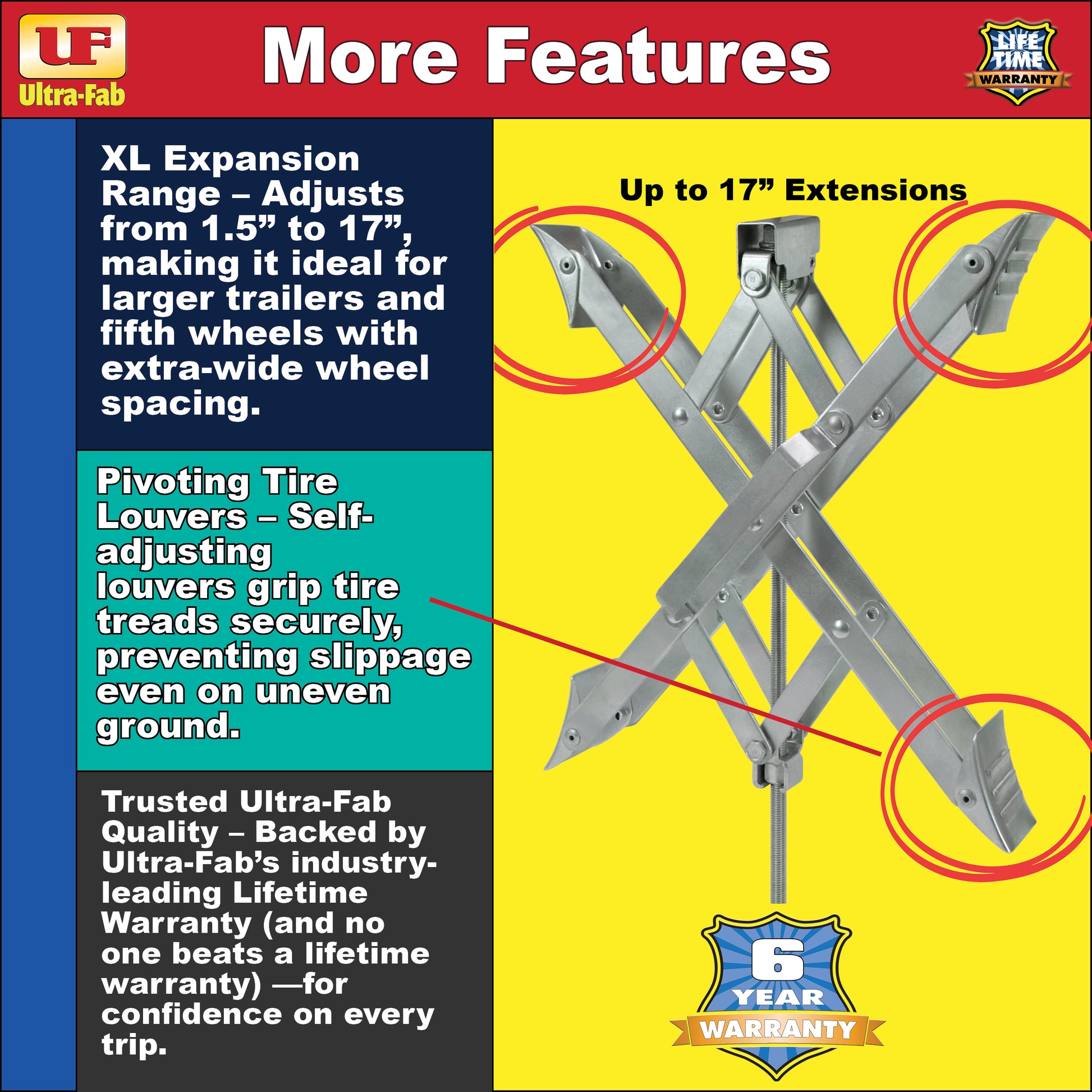 - XL Expansion Range – Includes two Super Grip Chocks that adjusts from 1" to 10.25", making it ideal for larger trailers and fifth wheels with extra-wide wheel spacing.