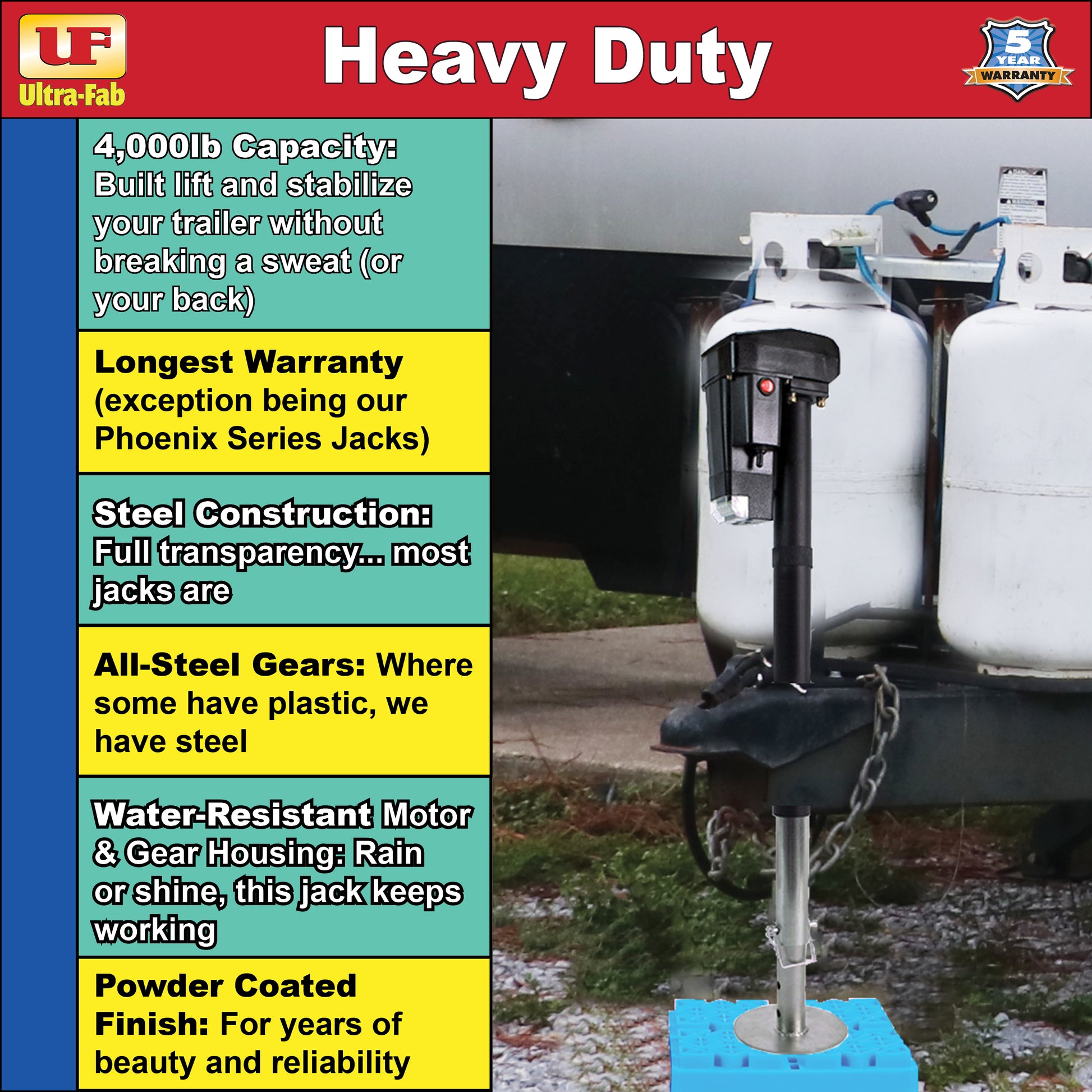 - Peace of Mind: Includes manual crank backup and a 10‑year warranty. Longest warranty of any tongue jack. No one beats an Ultra-Fab warranty.