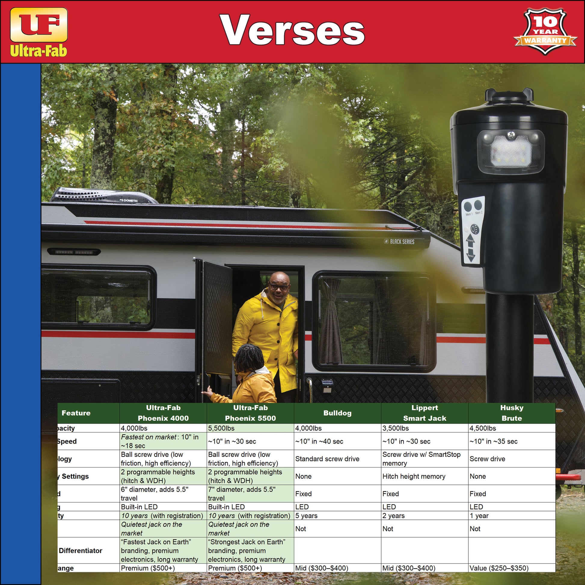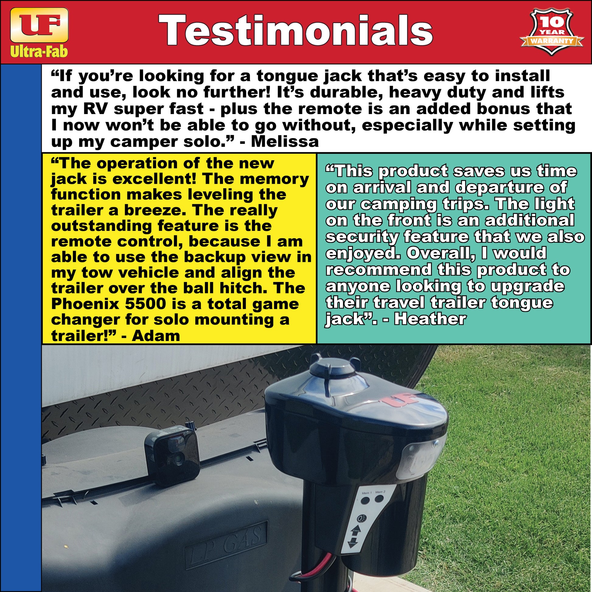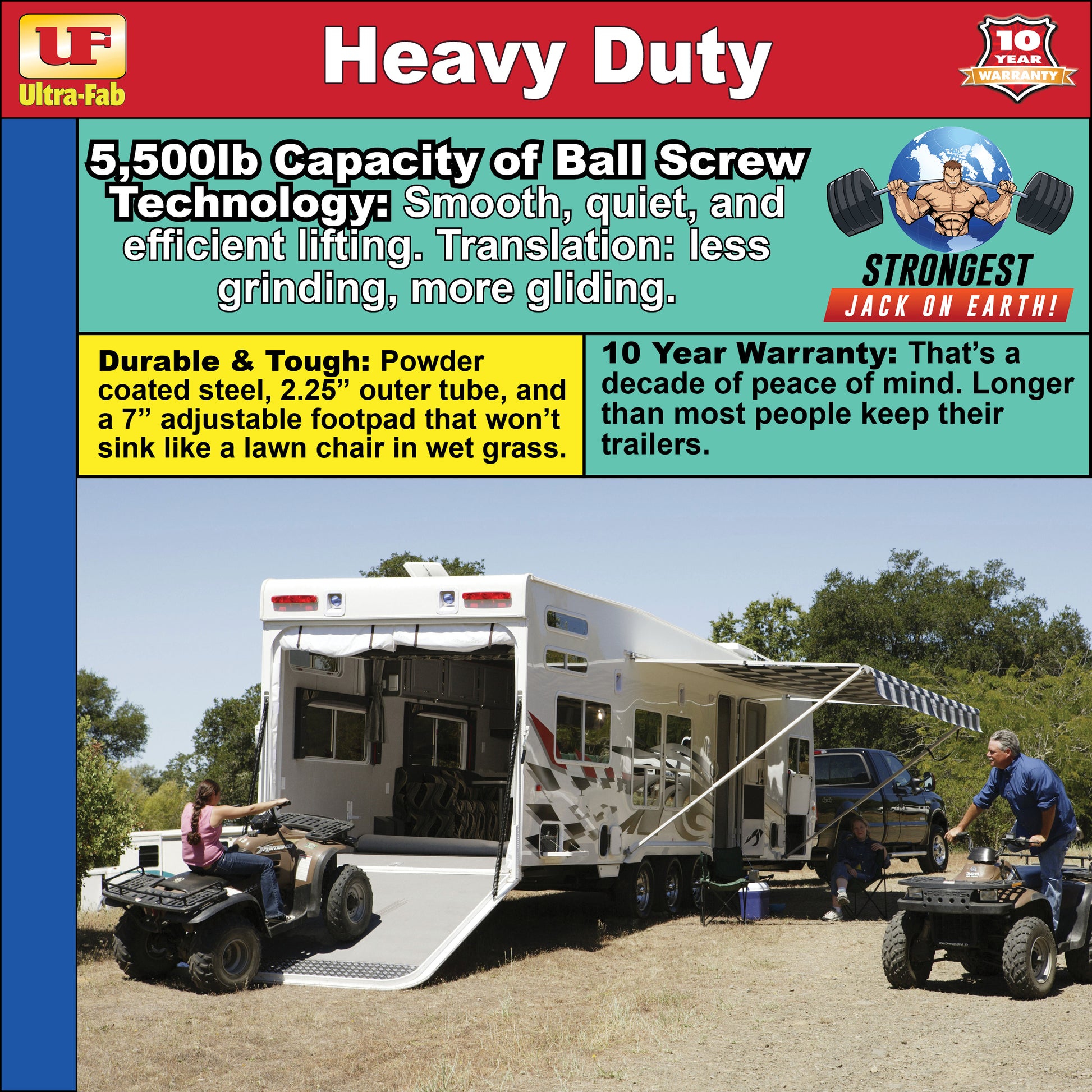 - Peace of Mind: Includes manual crank backup and a 10‑year warranty. Longest warranty of any tongue jack. No one beats an Ultra-Fab warranty.