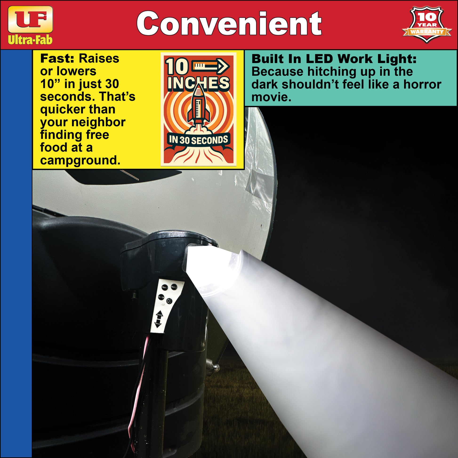 - Effortless Hitching: Designed to take the grunt work out of lifting and leveling your trailer. Lifts trailers up to 5,500lbs with ease. Ball Screw Technology is smooth, quiet & efficient. Even hitching at night is simple with built-in LED work light, because hitching up in the dark shouldn’t feel like a horror movie