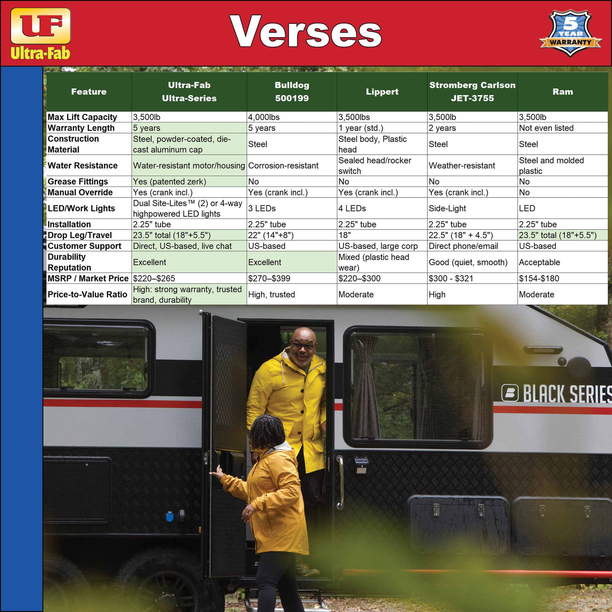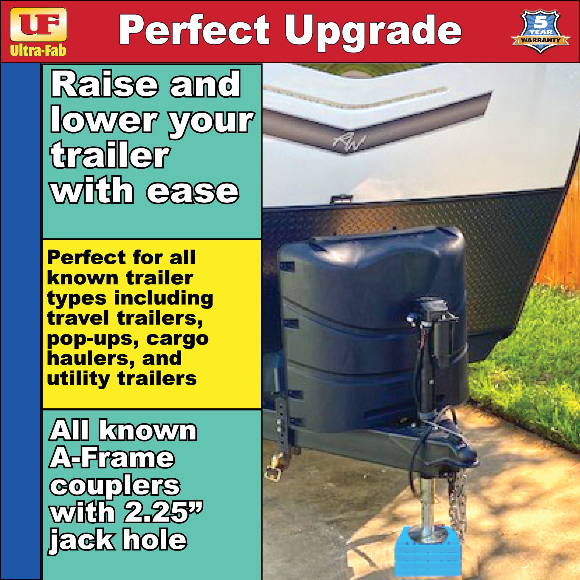 - Heavy-Duty Power You Can Trust – Raise / lower trailer with ease thanks to this 3,500lb capacity electric jack built tough for travel trailers, cargo haulers, and utility trailers with a 2.25” A-frame coupler. Lifts and stabilizes without breaking a sweat.