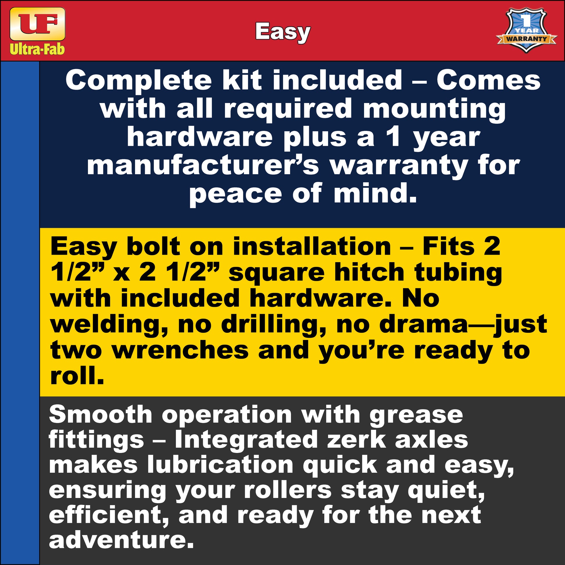 - Quick bolt‑on installation – Fits 2‑1/2" x 2‑1/2" square hitch tubing with included hardware. No welding, no drilling—just two wrenches and you’re ready to roll.