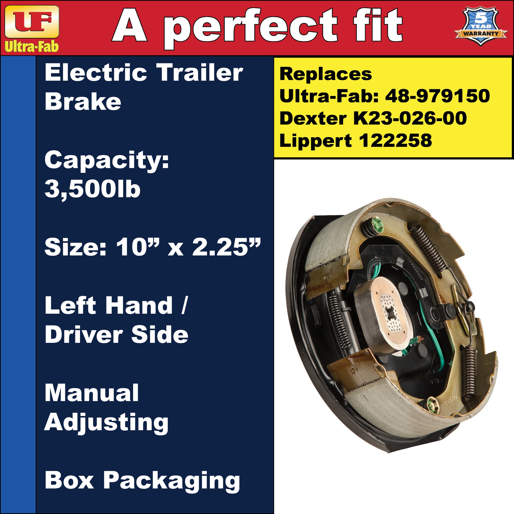 - Direct Replacement Fit: Perfect replacement manually adjustable electric trailer brake assembly for 12” x 2” brakes rated at 3,500lb. This is the left hand, driver side. Boxed packaging. Designed as a perfect OEM-style replacement for Dexter K23-026-00 or Lippert 122258.