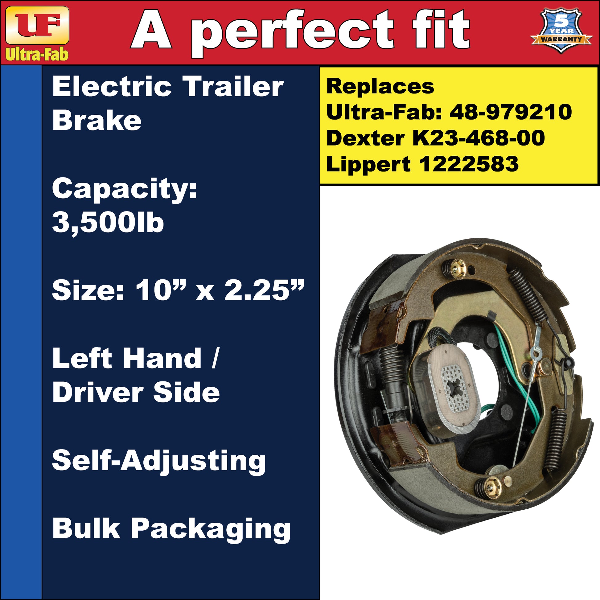 - Direct Replacement Fit: Perfect replacement self-adjusting electric trailer brake assembly for 10” x 2.25” brakes rated at 3,500lb. This is the left hand, driver side. Boxed packaging. Designed as a perfect OEM-style replacement for Dexter K23-468-00 or Lippert 1222583.