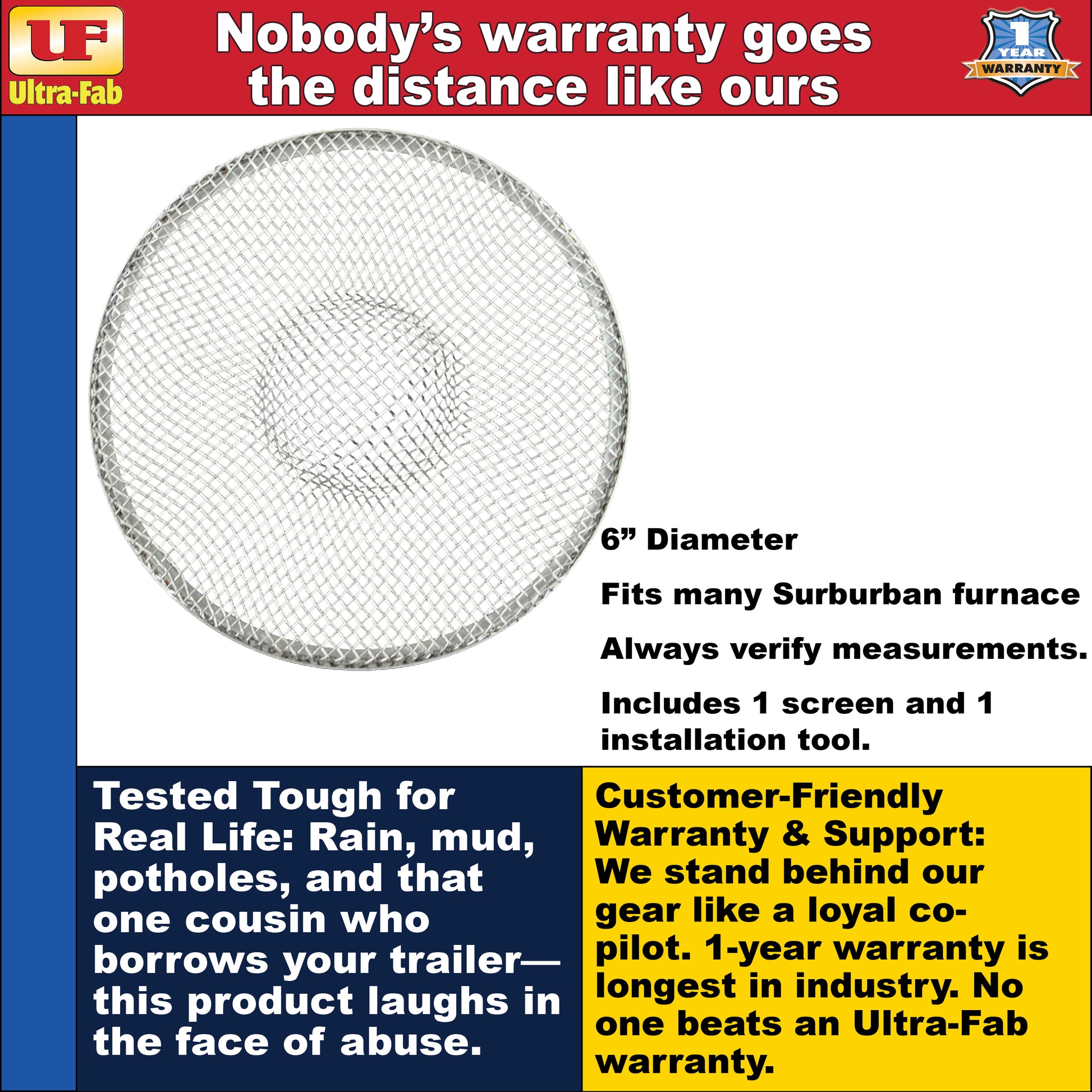 - Perfect Fit: Designed to be a perfect fit for most Suburban Furnaces. Measures 6” diameter. Check fit chart for verification. Replaces JCJ M700 or M-700, Camco 42143, Valterra A10-1303VP, JR Products 06-30275, Ventmate 68307 and Legacy FUR400. Includes 1 screen and installation tool.