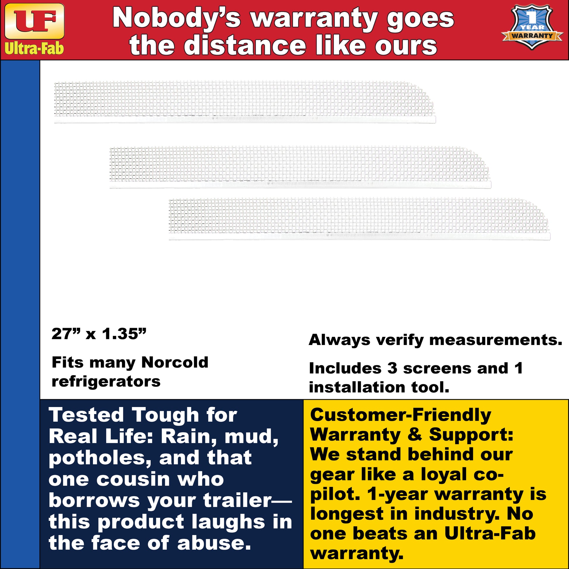 - Perfect Fit: Designed to be a perfect fit for most Norcold Refrigerators. Measures 27” x 1.35”. Check fit chart for verification. Replaces Camco 42153, JR Products 06-30265, Ventmate 68585 and Legacy RS700. Includes 3 screens and installation tool.