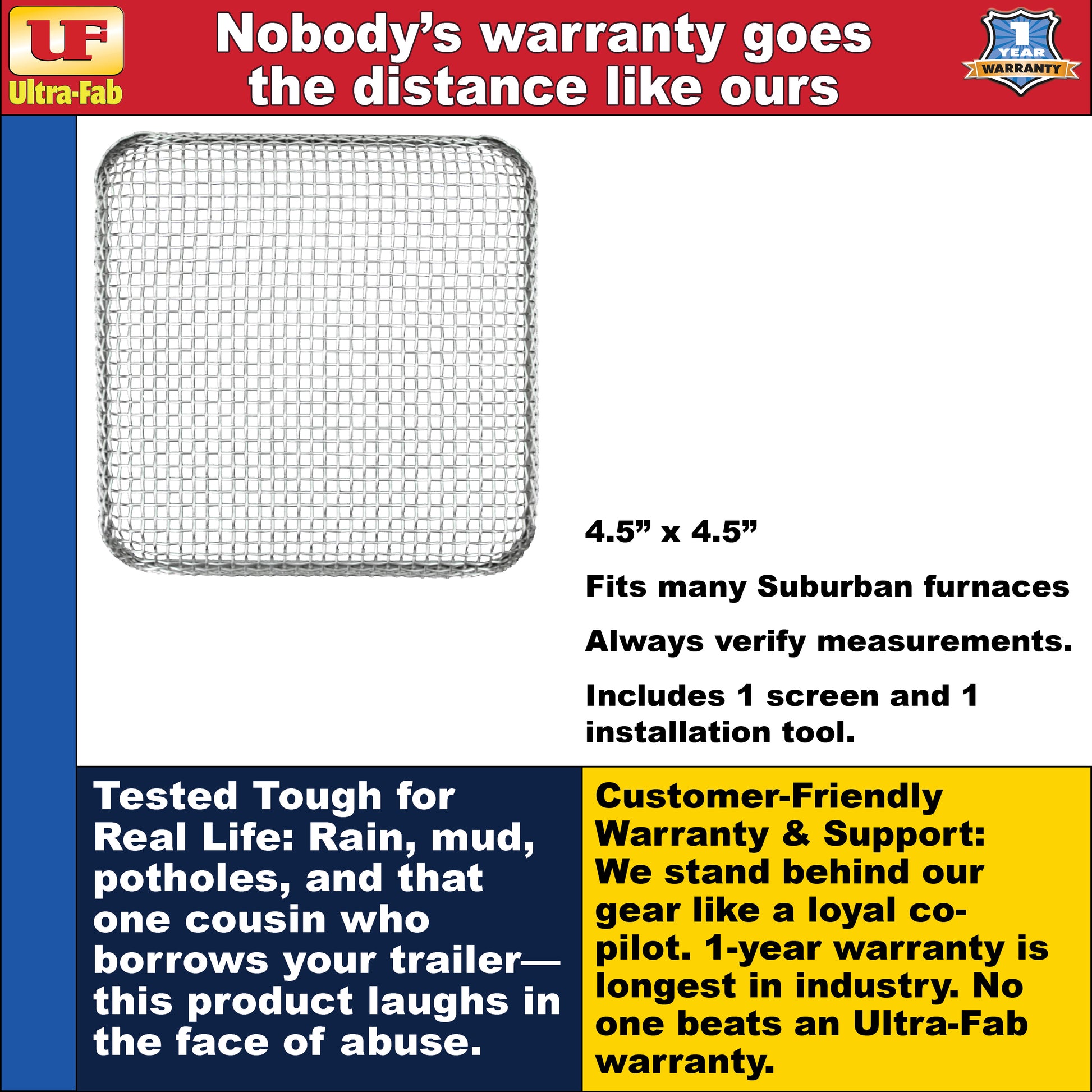 - Perfect Fit: Designed to be a perfect fit for most Suburban furnaces. Verify 4.5” x 4.5”. Check fit chart for verification. Replaces Camco 42150, Ventmate 68327 and Legacy WH200. Includes 1 screen and installation tool.