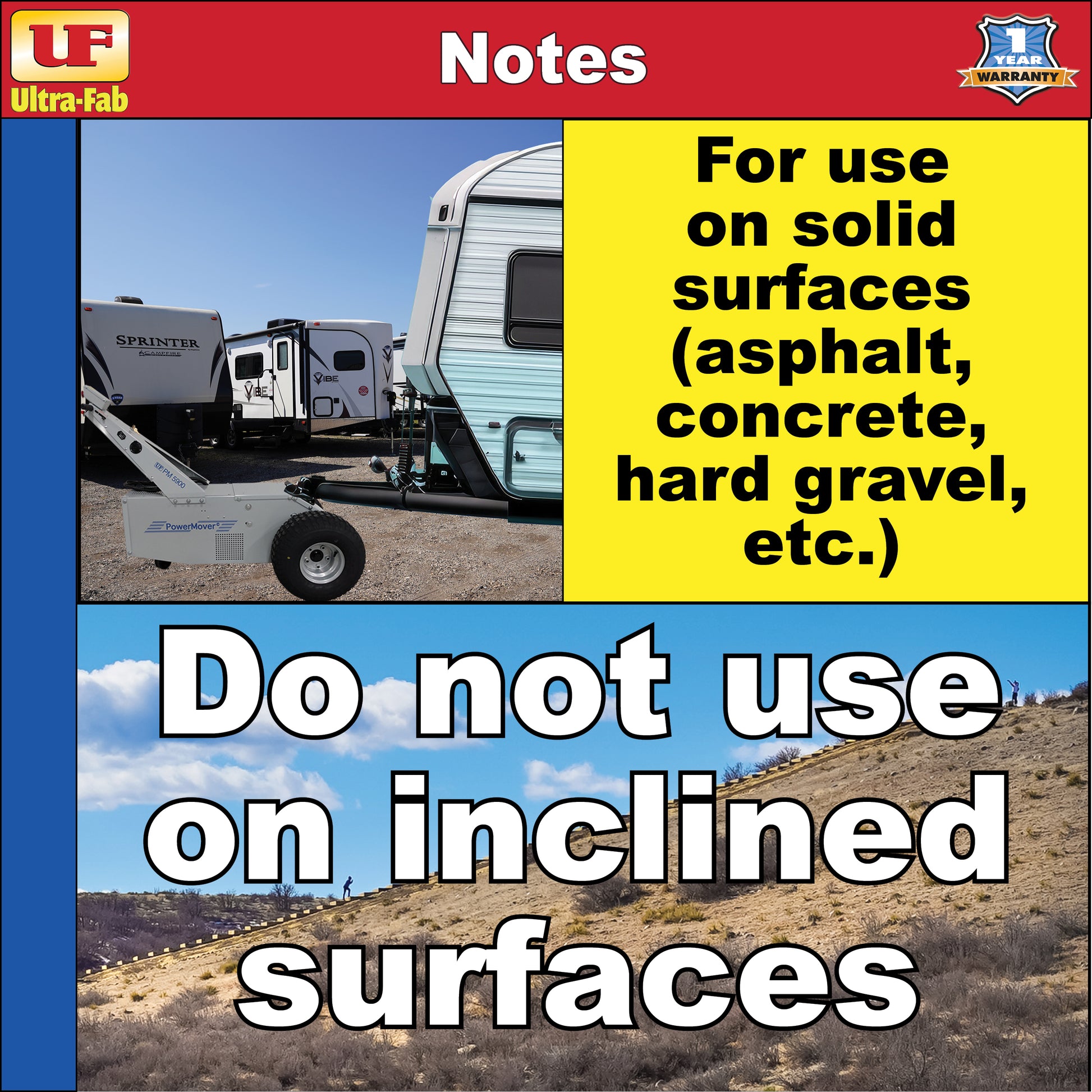 - EASE & SAFE TRAILER MOVEMENT: Designed to move travel trailers. Utilize either a 2” (UF# 41-013502) or a 2-5/16” (UF# 41-013501) hitch plate (sold separately). Removes bounce experienced when using forklifts, thus avoiding damage to trailer and especially to tongue jacks. Pintle hook attachment available (41-141055). For use on solid surfaces (asphalt, concrete, hard gravel, etc.).